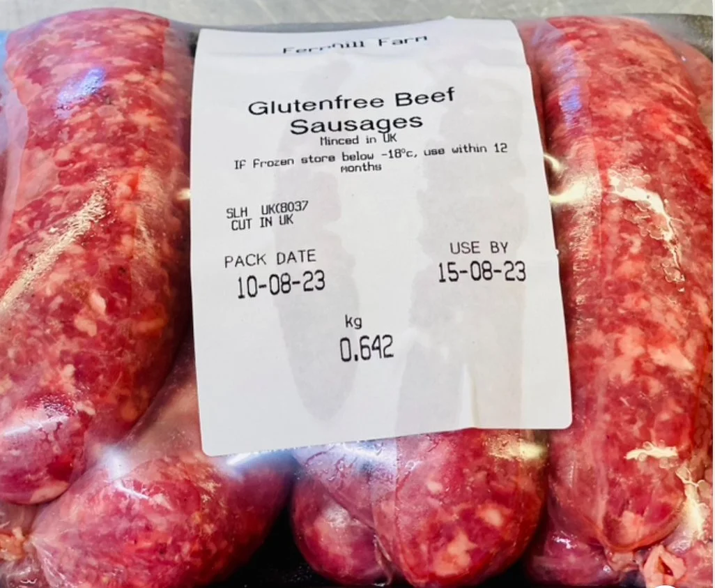 Aberdeen Angus Pasture-Fed beef sausages, available in 10 packs from our freezers.